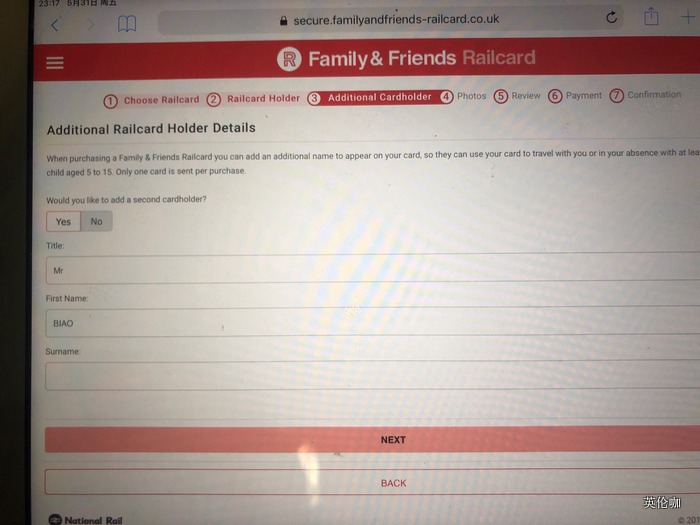 求助:电子家庭卡申请中,主申请人正常 ,添加第二个人的名正常姓也正常(见图一),后进入下一步,始终上面提示第三步Additional Cardholder是灰色的(见图二),到达上传照片这一步的时候,上传正常 ,第二人始终没有名字。点下一步就一直进入不了下一步,始终停留在上传照片这里(见图二)。如果退出重新进入,则始终提示填第二人的姓那个位置。不知道哪里出了问题。到首页重新进入,提示如图三。大神,救命!、(第二联系人姓王,WANG就是输了就变空白,后来输成W ANG就过了)但是这操作可以不?WANG 和W ANG,,,,