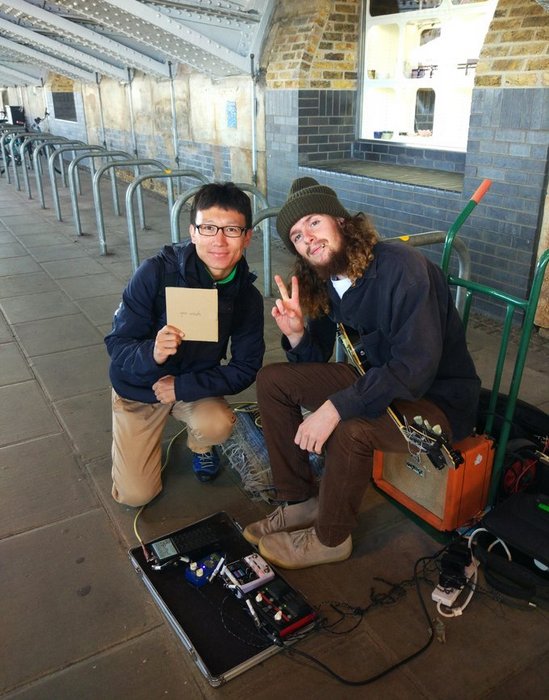 听多了北京地下通道里千篇一律的流行歌曲翻唱,能在伦敦地下通道里发现高品质的小众原创音乐,我们一致觉得捡到宝啊!果断花5胖子买了一张小哥的简易专辑,,,简易到盘壳是瓦楞纸做的,歌名是手写的,够环保!