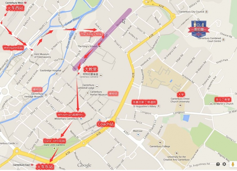 本次截图路线如下图,从坎特伯雷西站出发,中途会经过Westgate公园、The king's Mile、坎特伯雷大教堂、Whitefriars购物中心、Dane John花园,路线终点是坎特伯雷火车东站。